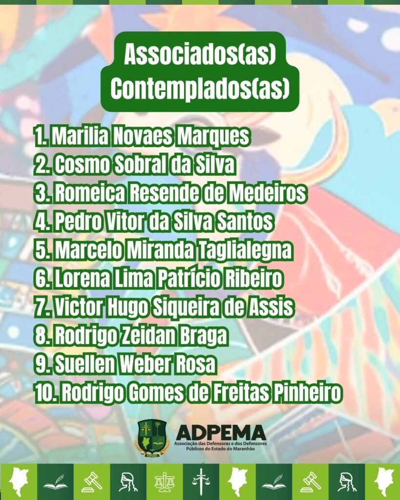A Associação das Defensoras e dos Defensores Públicos do Maranhão (ADPEMA) divulgou o resultado do sorteio de ajuda de custo destinado a associadas e associados que participarão do Encontro Regional Norte e Nordeste da ANADEP, que será realizado em novembro, em Fortaleza (CE).
